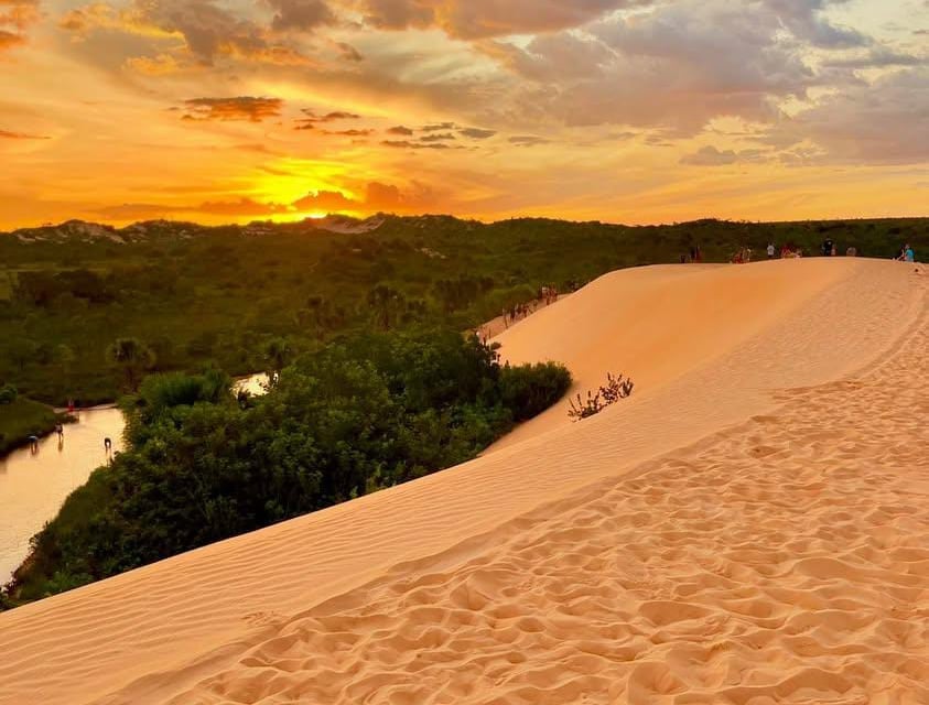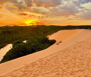 As dunas douradas são um dos cartões postais do Jalapão, com suas formas esculpidas pelo vento e a vegetação rasteira que as rodeia. O nascer e o por do sol são espetáculos inesquecíveis que podem ser apreciados neste local.